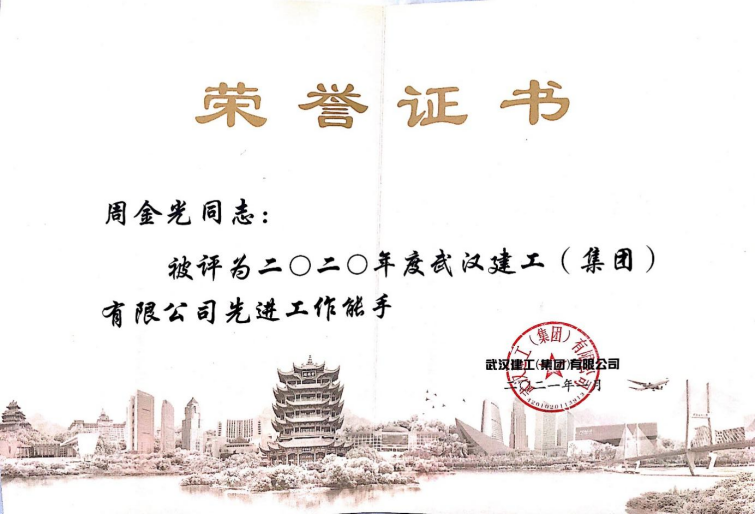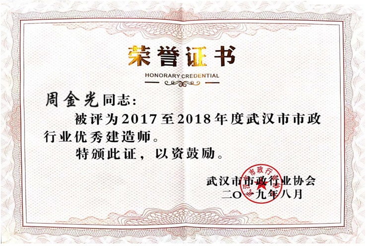 周金光,2011年毕业于南阳理工学院土工工程系土木工程(道路与桥梁方向)专业,现就职于武汉建工集团股份有限公司,目前岗位为武汉建工集团股份有限公司项目经理,荆州市建筑业协会理事,公安县安业建设有限公司总经理,房屋建筑工程及市政工程高级工程师,市政公用工程一级建造师。从业以来发表代表性论文8篇,参与发布湖北省工程建设QC活动成果8项,主持编制实用新型专利4项。
