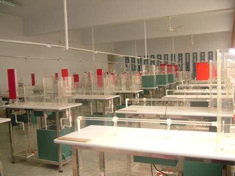 水力学实验室建于2010年,使用面积约240平方米,现有教学仪器设备共54余台,总值约35万元。现拥有静水压强仪、孔口管嘴初流实验仪 、伯努利实验仪、动量定理实验仪、局部阻力实验仪、沿程阻力系数实验仪、雷诺实验仪、明渠实验仪、毕托管测速实验仪、水击实验仪、离心泵性能综合实验仪、达西渗透实验仪、文丘里流量实验仪、流动演示实验仪、虹吸实验仪等。水力学实验室现有专职实验技术人员1人,兼职教师2人,承担我院道路桥梁与渡河工程、给排水工程2个专业 的水力学课程的实验教学需求。水力学实验室仪器设备先进,实验人员工作能力强、认真负责,目前实验室能开展以下试验项目:静水压强、能量方程实验、动量方程实验、雷诺实验、管流沿程阻力实验、管流局部阻力实验、明渠水面线演示实验、文丘里流量实验、明渠断面流速分布测定等实验项目,年受益人数100余人,可完成超过1000人时的实验教学任务。